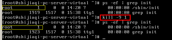 例:以下示例是在虚拟机中完成。init进程无法被强制结束。