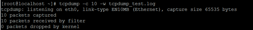 将抓包信息写入文件 -w 使用-w选项指定记录文件。 命令:tcpdump -c 10 -w tcpdump_test.log