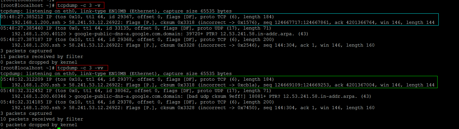 显示更详细的数据包信息 -v -vv 选项-v,-vv可以显示更详细的抓包信息。