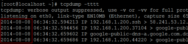 增加抓包时间戳 -tttt选项 使用-tttt选项,抓包结果中将包含抓包日期: 命令:tcpdump -tttt