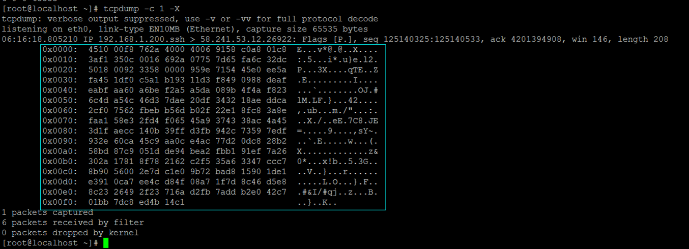方法二:使用-X参数能16进制数与ASCII码共同显示数据包。 例:只抓取1个数据包,并显示其内容。 命令:tcpdump -c 1 -X