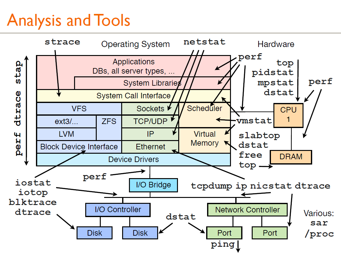sar、netstat、pidstat、strace、tcpdump、blktrace、iotop、slabtop、sysctl、/proc。