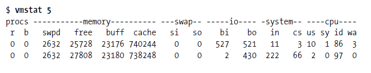 vmstat的常规用法:vmstat interval times即每隔interval秒采样一次,共采样times次,如果省略times,则一直采集数据,直到用户手动停止为止。