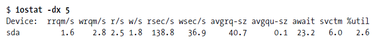 常见linux的磁盘IO指标的缩写习惯:rq是request,r是read,w是write,qu是queue,sz是size,a是verage,tm是time,svc是service。