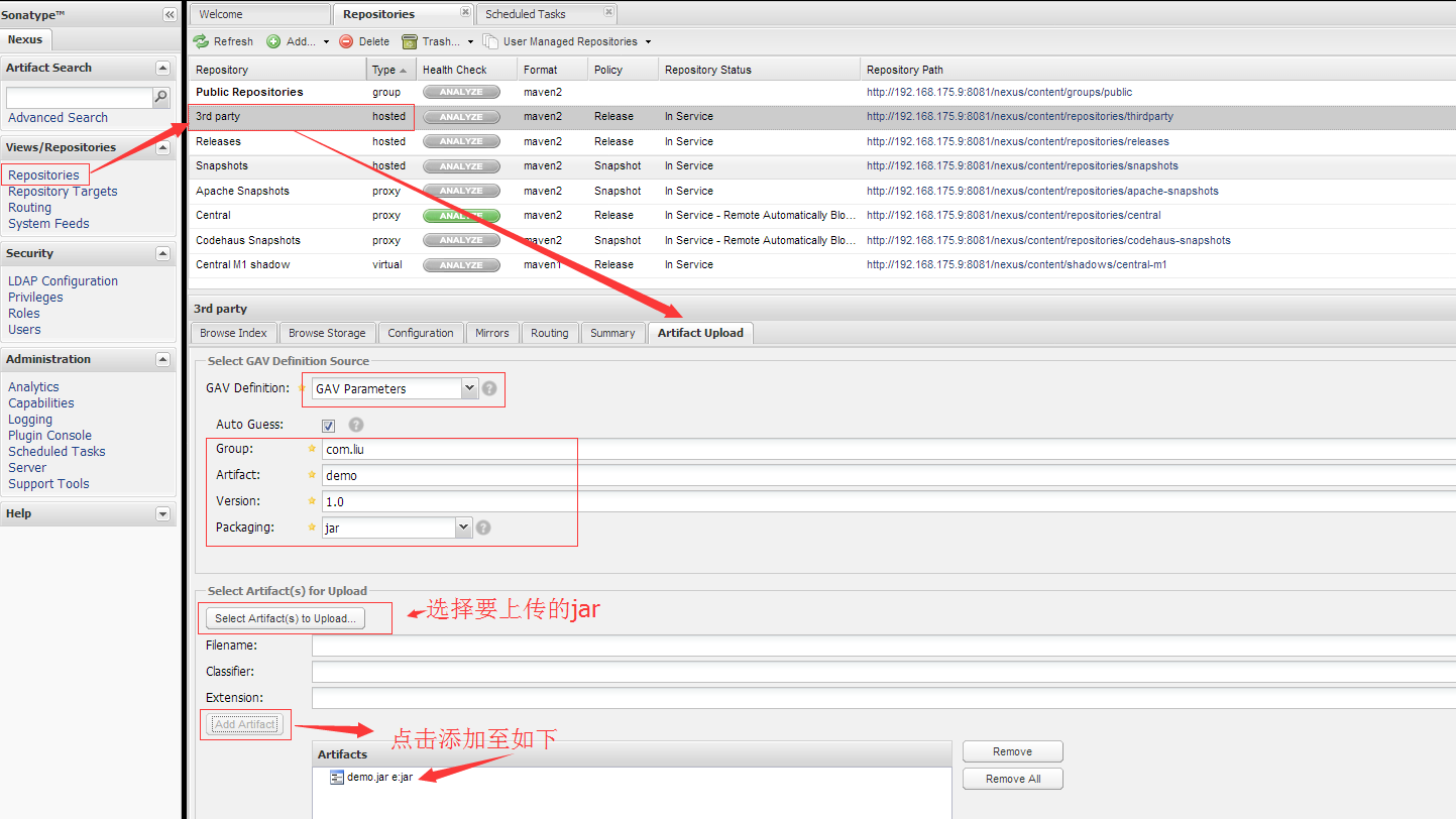 4、上传第三方jar,如:demo.jar