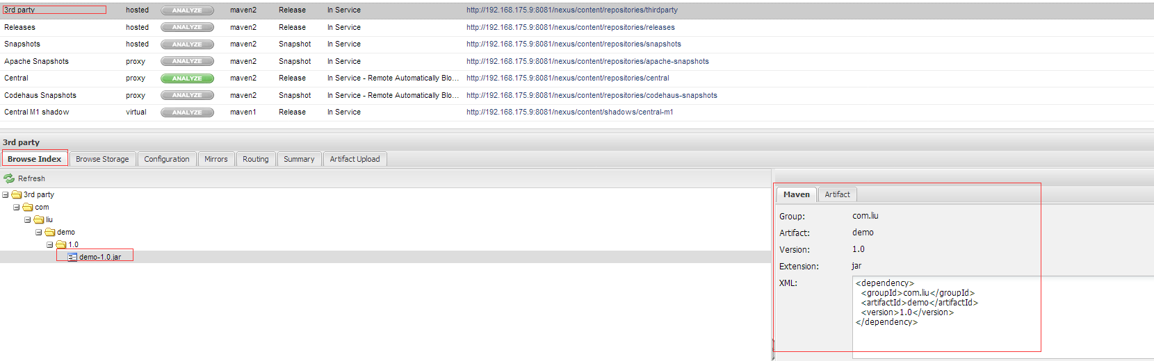 <distributionManagement> <repository> <id>nexus-releases</id> <name>Nexus Release Repository</name> <url>http://192.168.175.9:8081/nexus/content/repositories/releases/</url> </repository> <snapshotRepository> <id>nexus-snapshots</id> <name>Nexus Snapshot Repository</name> <url>http://192.168.175.9:8081/nexus/content/repositories/snapshots/</url> </snapshotRepository> </distributionManagement>