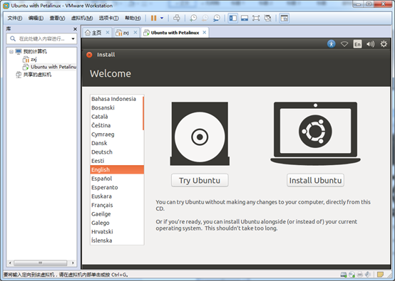 启动虚拟机,不能改为中文(Petalinux不支持),开始安装