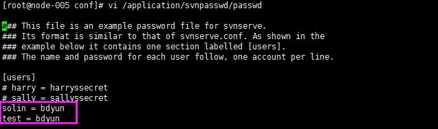 [root@node-005 conf]# egrep "\-access|\-db =" svnserve.conf # anon-access = none #不允许匿名访问 # auth-access = write #允许可写 # password-db = /application/svnpasswd/passwd #密码数据库,存放SVN吗 # authz-db = /application/svnpasswd/authz #控制权限的数据库