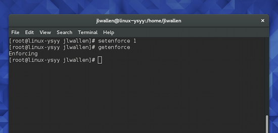 图 1:getenforce 命令显示 SELinux 的状态是 Enforcing 启用状态。 默认情况下,大部分系统的 SELinux 设置为 Enforcing。你要如何知道你的系统当前是什么模式?你可以使用一条简单的命令来查看,这条命令就是 getenforce。这个命令用起来难以置信的简单(因为它仅仅用来报告 SELinux 的模式)。要使用这个工具,打开一个终端窗口并执行 getenforce 命令。命令会返回 Enforcing、Permissive,或者 Disabled(见上方图 1)。 设置 SELinux 的模式实际上很简单——取决于你想设置什么模式。记住:永远不推荐关闭 SELinux。为什么?当你这么做了,就会出现这种可能性:你磁盘上的文件可能会被打上错误的权限标签,需要你重新标记权限才能修复。而且你无法修改一个以 Disabled 模式启动的系统的模式。你的最佳模式是 Enforcing 或者 Permissive。 你可以从命令行或 /etc/selinux/config 文件更改 SELinux 的模式。要从命令行设置模式,你可以使用 setenforce 工具。要设置 Enforcing 模式,按下面这么做:
