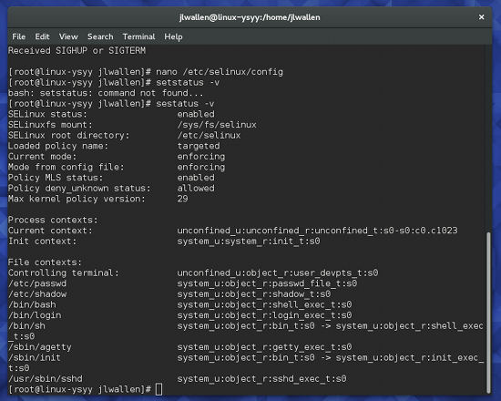 修改这个选项为 targeted 或 strict 以满足你的需求。 检查完整的 SELinux 状态有个方便的 SELinux 工具,你可能想要用它来获取你启用了 SELinux 的系统的详细状态报告。这个命令在终端像这样运行: