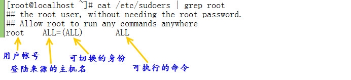 查看sudores文件,其中有一行如下图,定义了允许root用户从任何主机登陆,使用sudo可以切换成任何用户的身份,执行所有命令。