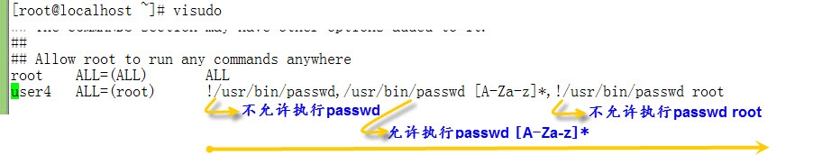 实例2:设置普通用户user4,使其可以使用sudo命令以root用户身份修改其他所有用户登录密码,但不能修改root用户登陆密码