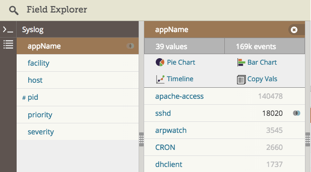 $ awk '/sshd.*invalid user/ { print $9 }' /var/log/auth.log guest admin info test ubnt - 用日志管理系统自动解析日志,然后在需要的应用名称上点击过滤。下面是在 Loggly 日志管理服务中提取 syslog 域的截图。我们对应用名称 “sshd” 进行过滤,如维恩图图标所示。