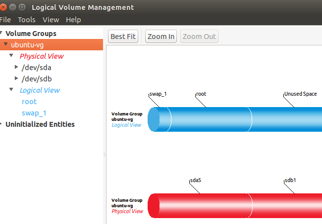卷组视图会列出你所有的物理卷和逻辑卷的总览。这里,我们有两个横跨两个独立硬盘驱动器的物理分区,我们有一个交换分区和一个根分区,这是Ubuntu默认设置的分区图表。由于我们从另一个驱动器添加了第二个物理分区,现在那里有大量未使用空间。