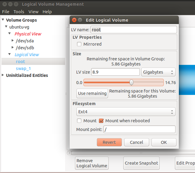 system-config-lvm的其它选项允许你设置快照和镜像。对于传统桌面而言,你或许不需要这些特性,但是在这里也可以通过图形化处理。记住,你也可以使用终端命令完成这一切。