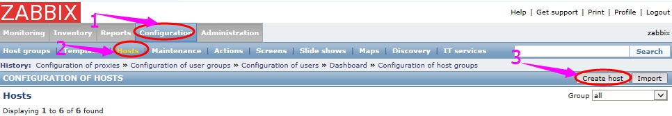 一类的hosts可以归属到用一个host group,便于分类管理同一类设备,在 Configuration --> Host Group --> Create Host Group可以添加设备组