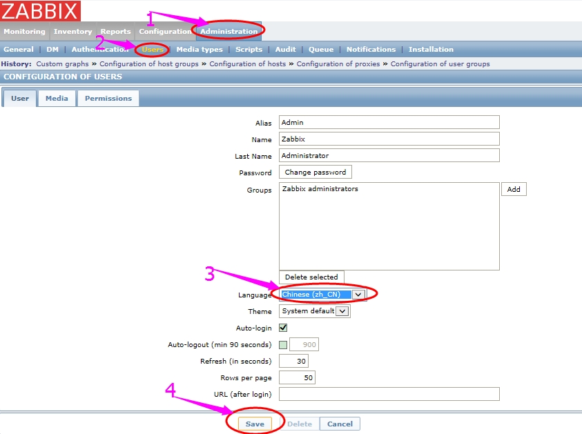Administration --> Users --> Members(Admin(Zabbix Administrator)) --> Language (选择Chinese(zh_CN)) --> Save