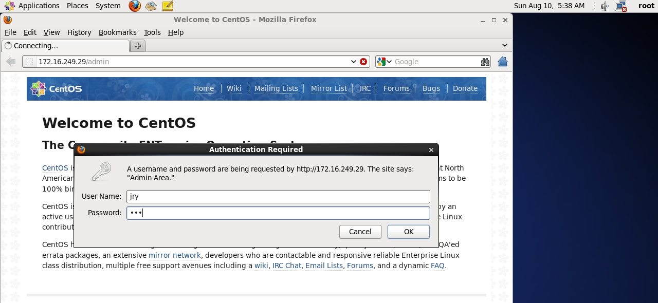cd /var/www/html mkdir admin mkdir bbs vim bbs/index.html hello a vim /etc/httpd/conf/httpd.conf <Directory "/var/www/html/admin"> Options none Allowoverride AuthConfig AuthType Basic AuthName "Admin Area." AuthUserFile /etc/httpd/conf/.httpasswd Require valid-user </Directory>