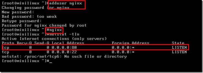 1、编译,配置ngnix useradd nginx ./configure --conf-path=/etc/nginx/nginx.conf --user=nginx --group=nginx \ --without-pcre --without-http_rewrite_module make && make install # 提供主页面 echo "hello" > /usr/local/nginx/html/index.html 2、复制到虚拟根文件系统下 cp -a /etc/ngnix/ /mnt/sysroot/etc cp -a /usr/local/nginx/ /mnt/sysroot/usr/local/ 3、复制nginx所依赖的库文件 #使用bincp.sh脚本完成,注意此时nginx要在PATH环境变量中 4、修改 /mnt/sysroot/etc/profile 文件,添加: export PATH=/bin:/sbin:/usr/bin:/usr/sbin:/usr/local/nginx/sbin/