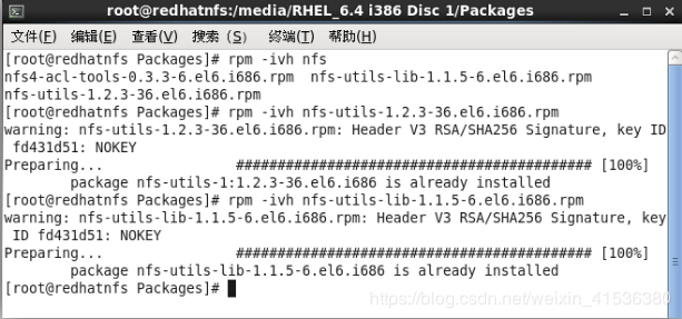 输入命令[root@redhatnfs Packages]# rpm -ivh nfs,接着按【Tab】键,自动会列出都有哪些以nfs开头的安装包,如图