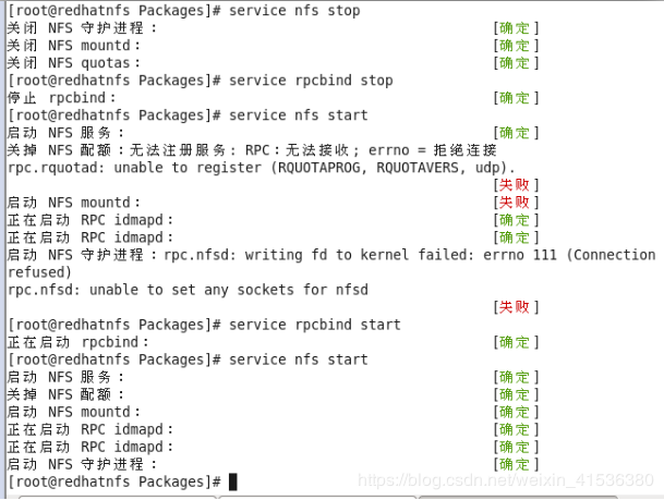 NFS服务器有启动顺序的要求,要先启动rpcbind,然后再启动NFS,否则NFS quotas和NFS daemon都将启动失败,如图