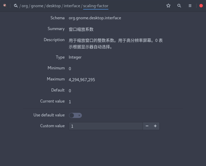 dconf-editor 接下去按照路径 /org/gnome/desktop/gnome/interface 进入,下拉滚动条找到 scaling-factor 选项,修改为 1。