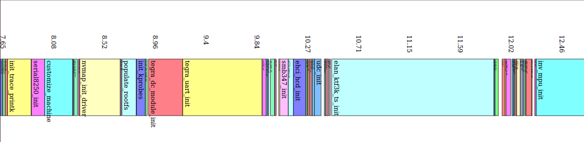 对于内核启动的优化,可以通过 bootgraph.pl 脚本(位于内核源码的?script/bootgraph.pl)来绘制内核启动耗时图表,用以分析启动最耗时的地方。这个脚本使用非常简单,直接将 dmesg 的输出作为其输入,即可生成 svg 图表: