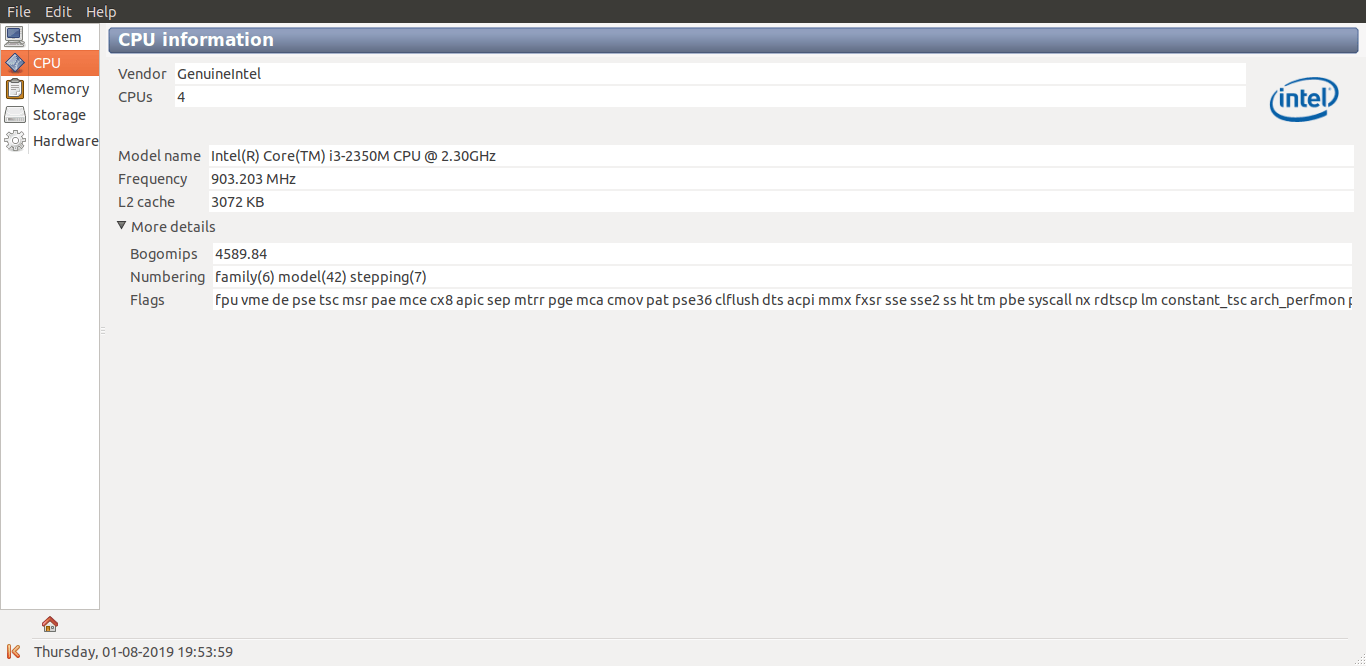 sysinfo 界面 如你所见,所有硬件(和软件)详细信息都分为五类,即系统、CPU、内存、存储和硬件。单击导航栏上的类别以获取相应的详细信息。