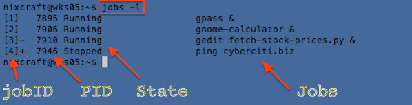 [1] 7895 Running gpass & [2] 7906 Running gnome-calculator & [3]- 7910 Running gedit fetch-stock-prices.py & [4]+ 7946 Stopped ping cyberciti.biz