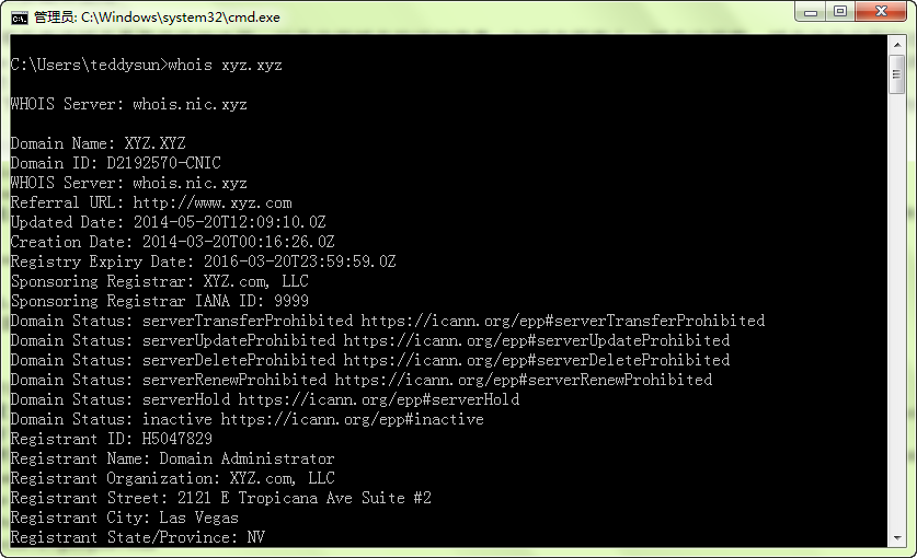 2、Windows 下 whois 命令行的配置文件 android domain-registry-whois.l.google.com google domain-registry-whois.l.google.com xyz whois.nic.xyz tokyo whois.nic.tokyo 然后,再查询那些原本不支持的域名后缀,就可以了,比如这里查询 xyz.xyz 如下图所示: