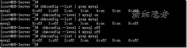 [root@DB-Server ~]# chkconfig --list mysql mysql 0:off 1:off 2:on 3:on 4:on 5:on 6:off [root@DB-Server ~]# chkconfig --del mysql [root@DB-Server ~]# chkconfig --list | grep mysql [root@DB-Server ~]# chkconfig --add mysql You have new mail in /var/spool/mail/root [root@DB-Server ~]# chkconfig --list | grep mysql mysql 0:off 1:off 2:on 3:on 4:on 5:on 6:off [root@DB-Server ~]#