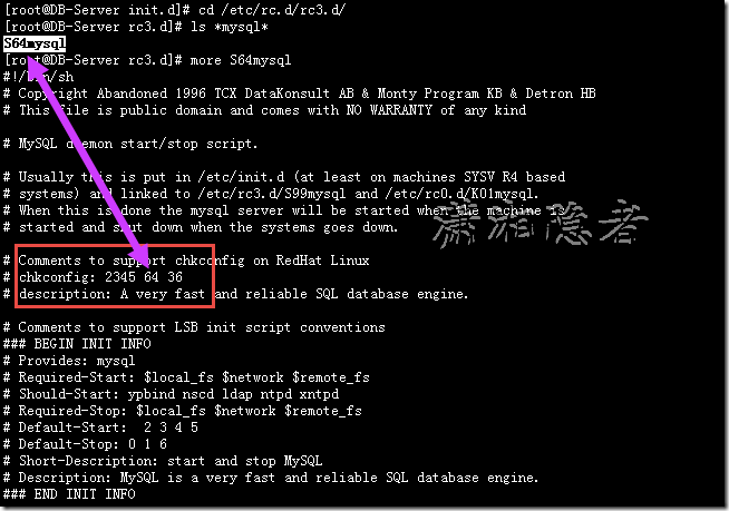 chkconfig service_name on [root@DB-Server ~]# chkconfig mysql on --level 3 [root@DB-Server ~]# chkconfig mysql off --level 45 [root@DB-Server ~]# 新增开机自启动MySQL服务,我们会在/etc/rc.d/rcn.d下看到生成了一个对应的文件,例如/etc/rc.d/rc3.d