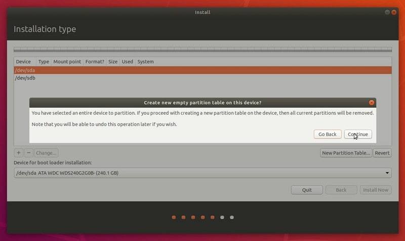如果你选择了“擦除磁盘并安装 Ubuntu”,点击“继续”,直接跳到第四步, 如果你选择了高级选项,请按照下面剩下的部分进行操作。 选择固态硬盘,然后点击“新建分区表”。