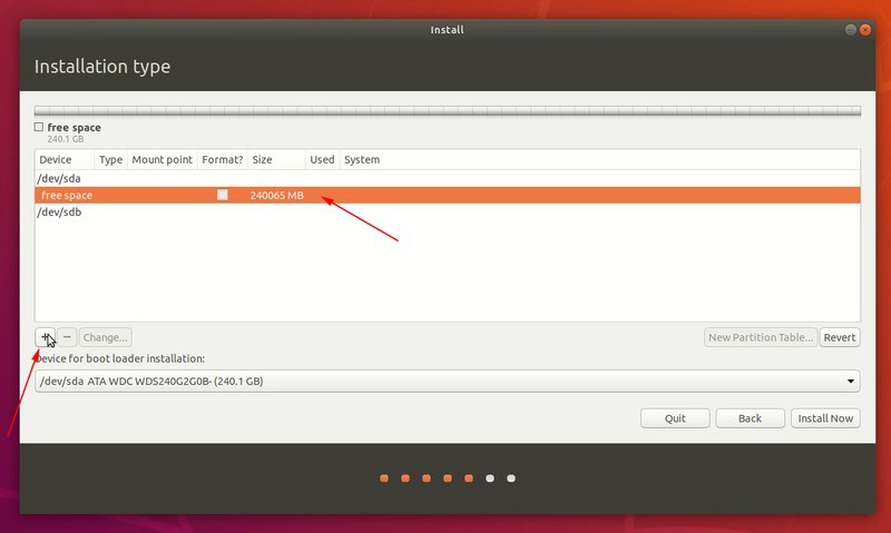 现在你就可以看到你 SSD 磁盘里的空闲空间。我的想法是为 EFI bootloader 创建一个 EFI 系统分区。一个根(/)分区,一个主目录(/home)分区。这里我并没有创建交换分区。Ubuntu 会根据自己的需要来创建交换分区。我也可以通过创建新的交换文件来扩展交换分区。 我将在磁盘上保留近 200 GB 的可用空间,以便可以在此处安装其他 Linux 发行版。你可以将其全部用于主目录分区。保留单独的根分区和主目录分区可以在你需要重新安装系统时帮你保存里面的数据。 选择可用空间,然后单击加号以添加分区。