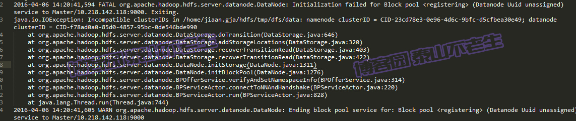此问题是由于每次启动Hadoop集群时,会有不同的集群ID,所以需要清理启动失败节点上data目录(比如我创建的/home/jiaan.gja/hdfs/data)中的数据。