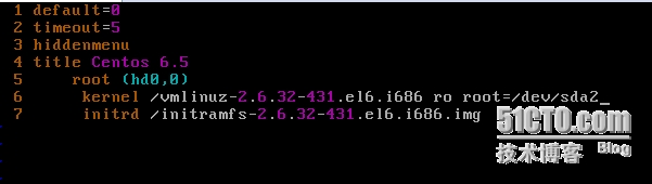 default=0 ***默认启动的系统,0 表示第一个title 的系统 timeout=5 ***菜单停留的时间 splashp_w_picpath=(hd0,0)/grub/splash.xpm.gz ***启动时的背景 hiddenmenu ***菜单是隐藏的 title CentOS (2.6.32-431.el6.i686) ***每个系统的标示 root (hd0,0) ***hd0 表示第一个盘,0表示第一个分区 kernel /vmlinuz-2.6.32-431.el6.i686 ***加载根分区的内核,,此时的根是/boot ro ***以只读方式来进行引导 root=UUID=4a3e9e54-2ed5-4796-9702-774aac0e74a4 ***加载完内核后真正的根分区 rd_NO_LUKS KEYBOARDTYPE=pc KEYTABLE=us rd_NO_MD crashkernel=auto LANG=zh_CN.UTF-8 rd_NO_LVM rd_NO_DM rhgb ***以图形方式来进行引导 quiet ***静默模式,启动时信息不再凌乱 initrd /initramfs-2.6.32-431.el6.i686.img ***额外的驱动,放置的镜像