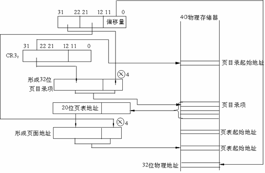 - CR3包含着页目录的起始地址,用32位线性地址的最高10位A31~A22作为页目录的页目录项的索引,将它乘以4,与CR3中的页目录的起始地址相加,形成相应页表的地址。