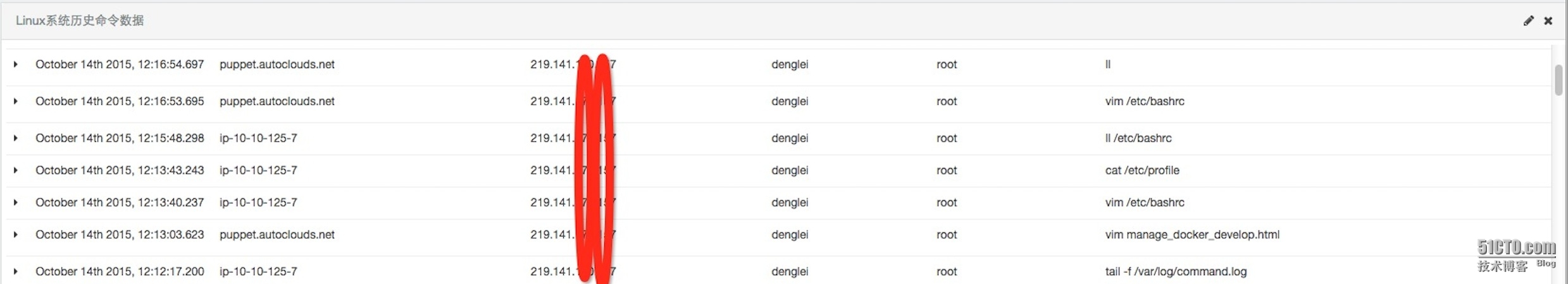 主要是展示每条收集数据内容,包括收集时间、收集的主机名、当前登陆ip、登陆用户、当前用户、运行命令。