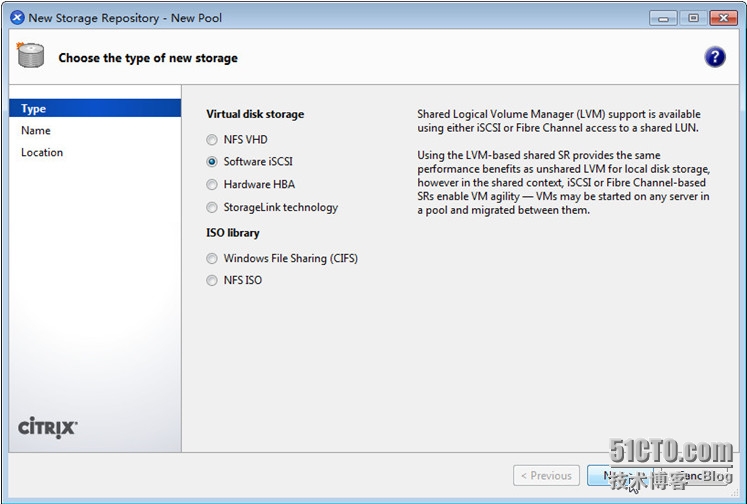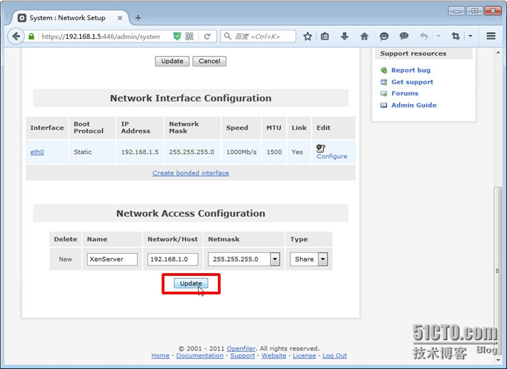 在Network Access Configuration配置窗口中,Name对应的文本框自定义,此处填写为XenServer,Network/Host处填写要添加iSCSI存储的主机的网段,Netmask选择子网掩码255.255.255.0,Type默认为share,不作更改。点击Update更新操作。