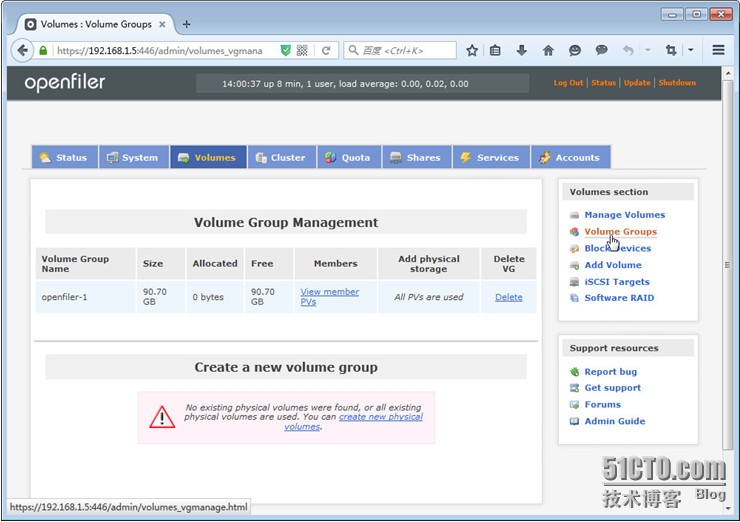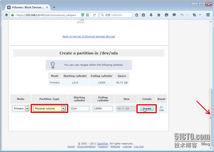 接着输入reboot重启openfiler,重启完毕后刷新一下刚才的Web界面即可看到创建好的物理卷sda4