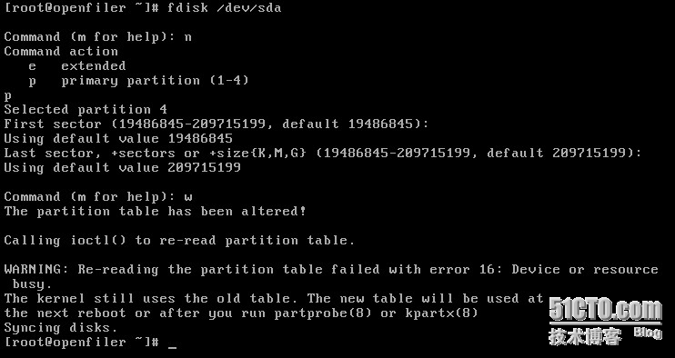登录进openfiler后,输入命令: fdisk /dev/sda(此处sda为第一块硬盘)