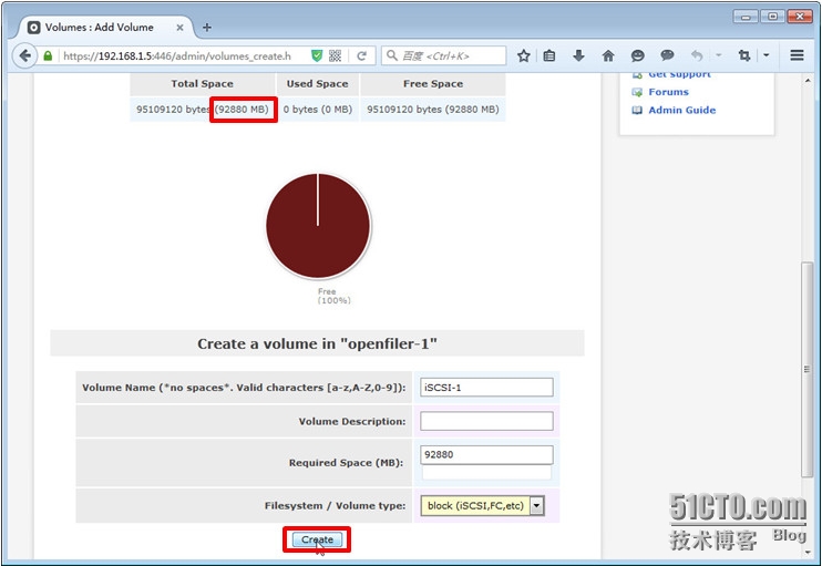 在volume Name处添加卷的名称,Required Space(MB)处填写分配的空间大小,此处填写Total Space处的最大值922880,以MB为单位,Filesystem/Volume type文件系统/卷的类型处选择block(iSCSI,FC,etc),点击Create创建