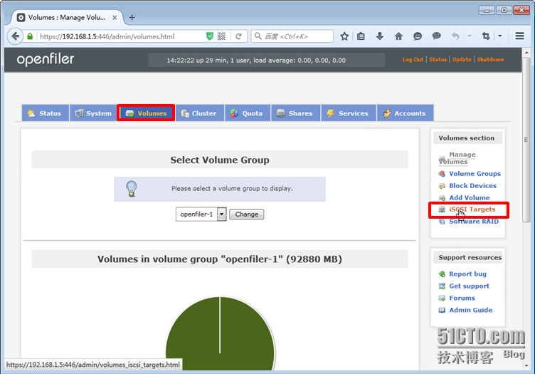 通过浏览器的方式登录Web管理界面:地址栏处填写上面Web administration GUI的地址:https://192.168.1.5:446/,用户名为:openfiler,密码为:password。