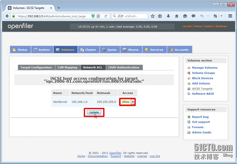 将Access中的Deny更改为Allow,允许192.168.1.0的网段进行访问iSCSI目标,点击Update更新操作