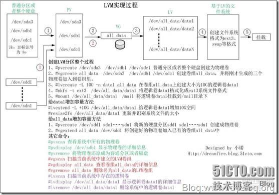 Linux LVM逻辑卷配置过程详解 许多Linux使用者安装操作系统时都会遇到这样的困境:如何精确评估和分配各个硬盘分区的容量,如果当初评估不准确,一旦系统分区不够用时可能不得不备份、删除相关数据,甚至被迫重新规划分区并重装操作系统,以满足应用系统的需要。 LVM是Linux环境中对磁盘分区进行管理的一种机制,是建立在硬盘和分区之上、文件系统之下的一个逻辑层,可提高磁盘分区管理的灵活性。RHEL5默认安装的分区格式就是LVM逻辑卷的格式,需要注意的是/boot分区不能基于LVM创建,必须独立出来。 LVM的配置过程也很简单,并不是很难,为此,我画了一张图文并茂的解析图,解析了LVM创建的整个过程。更详细的理论知识还请参看一些教程或者去Google哦!