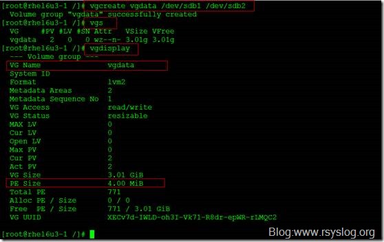 创建卷组 vgdata ,并将刚才创建好的两个物理卷加入该卷组.可以看出默认PE大小为4MB,PE是卷组的最小存储单元.可以通过 –s参数修改大小。