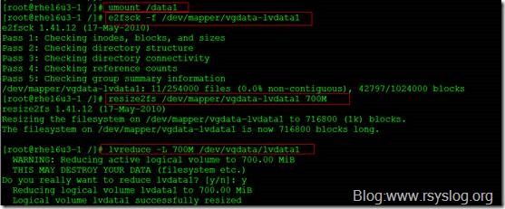 四、当硬盘空间不够用的情况下,如果减少逻辑卷的空间释放给其他逻辑卷使用。 减少逻辑卷空间,步骤如下 1、 先卸载逻辑卷data1 2、 然后通过e2fsck命令检测逻辑卷上空余的空间。 3、 使用resize2fs将文件系统减少到700M。 4、 再使用lvreduce命令将逻辑卷减少到700M。 注意:文件系统大小和逻辑卷大小一定要保持一致才行。如果逻辑卷大于文件系统,由于部分区域未格式化成文件系统会造成空间的浪费。如果逻辑卷小于文件系统,哪数据就出问题了。