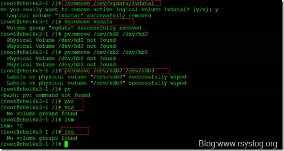 六、删除整个逻辑卷 1、先通过umount命令卸载掉逻辑卷lvdata1 2、修改/etc/fstab里面逻辑卷的挂载信息,否则系统有可能启动不起来。 3、通过lvremove 删除逻辑卷lvdata1 4、通过vgremove 删除卷组vgdata 5、通过pvremove 将物理卷转化成普通分区。
