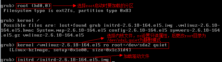 kernel /vmlinuz-2.6.18-164.el5 ro root=/dev/sda2 quiet //指明内核