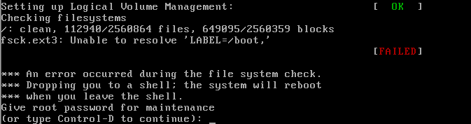 由上面的错误提示,我们可以知道是/boot的挂载配置出现错误,我们可以输入密码后进入系统改正错误